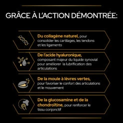 PRO PLAN® a mis au point une gamme d’aliments complémentaires ciblés destinés à agir sur la mobilité, l’immunité, la vitalité, la digestion, la peau & le pelage et le bien-être. PRO PLAN® Mobility+ soutient les articulations de votre chien, grâce à une formule concentrée contenant du collagène (issu de la membrane de l’œuf), de l’acide hyaluronique (purifié), des moules vertes et de la glucosamine. Sa formule est scientifiquement conçue pour : – Soutenir la mobilité et la flexibilité des articulations. – Améliorer la mobilité du chien